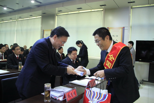 十堰中院院长张忠斌向杨思孝赠送纪念品